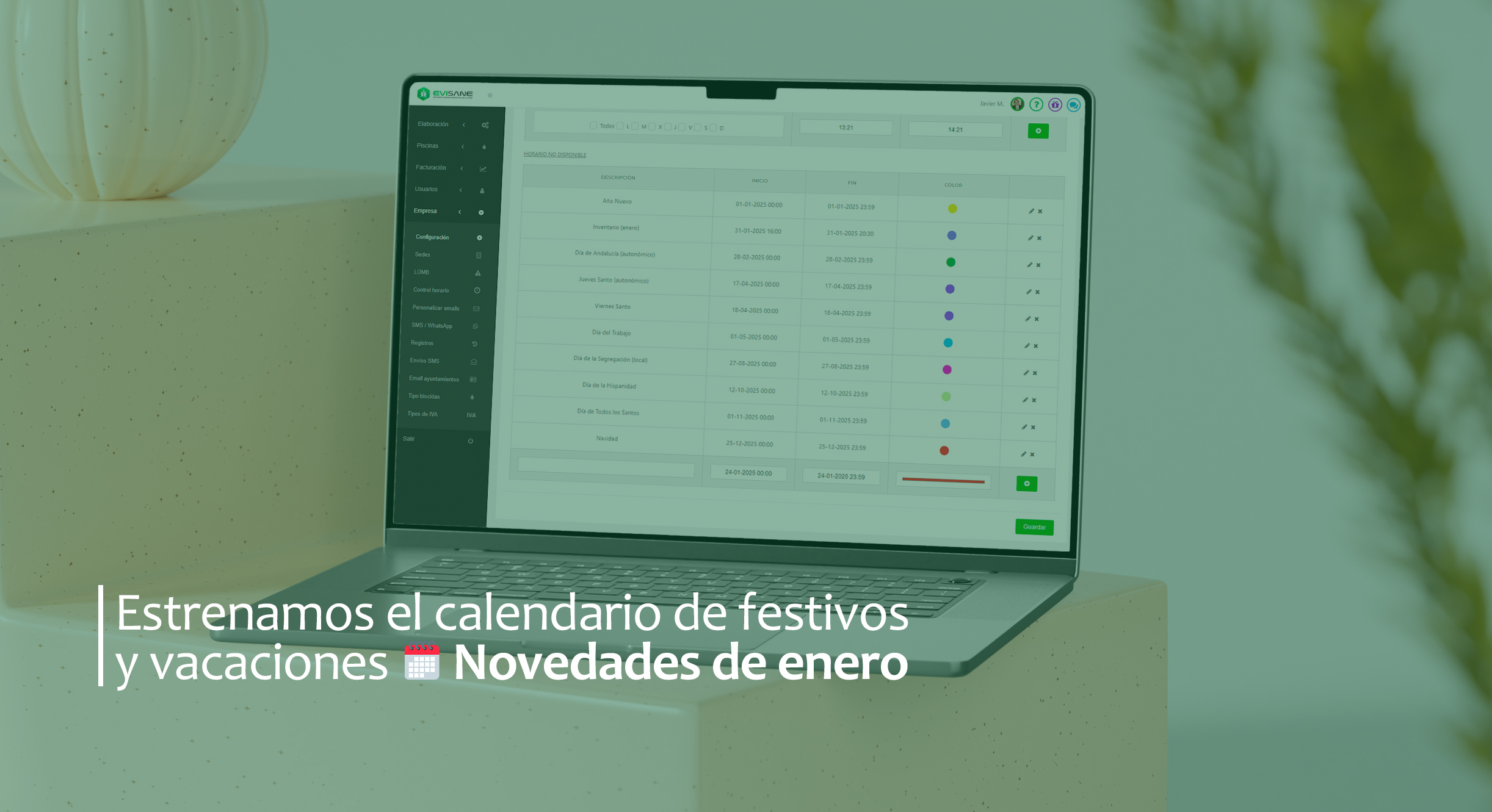 En EviSane sabemos que la gestión de todas las áreas de tu empresa puede ser un 🦴 duro de roer. Por eso, en nuestra búsqueda incansable en el perfeccionamiento de nuestro software en la nube 👨🏻💻👩🏻💻 nos hemos puesto manos a la obra para mejorar, una vez más, el control que llevas de tus jornadas laborales. Hoy te presentamos una nueva forma de gestionar al 100% todas las casuísticas que se puedan presentar 🗓️ en tu planificación anual del horario de tu equipo: ¡Bienvenido calendario de festivos, vacaciones y períodos no disponibles! 👋🏻