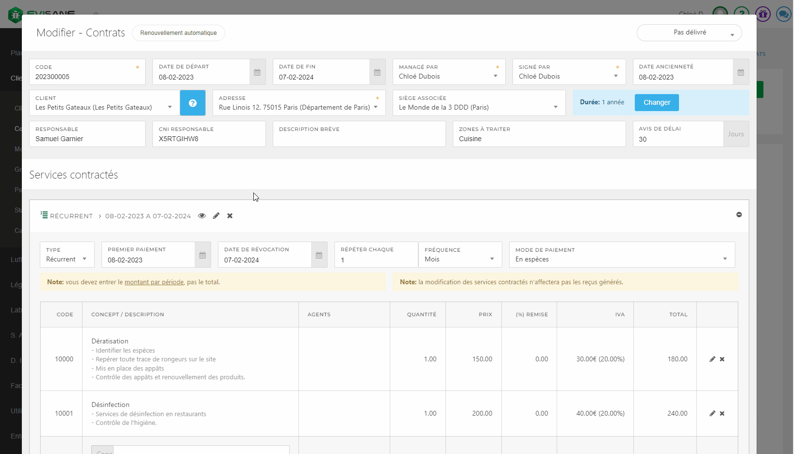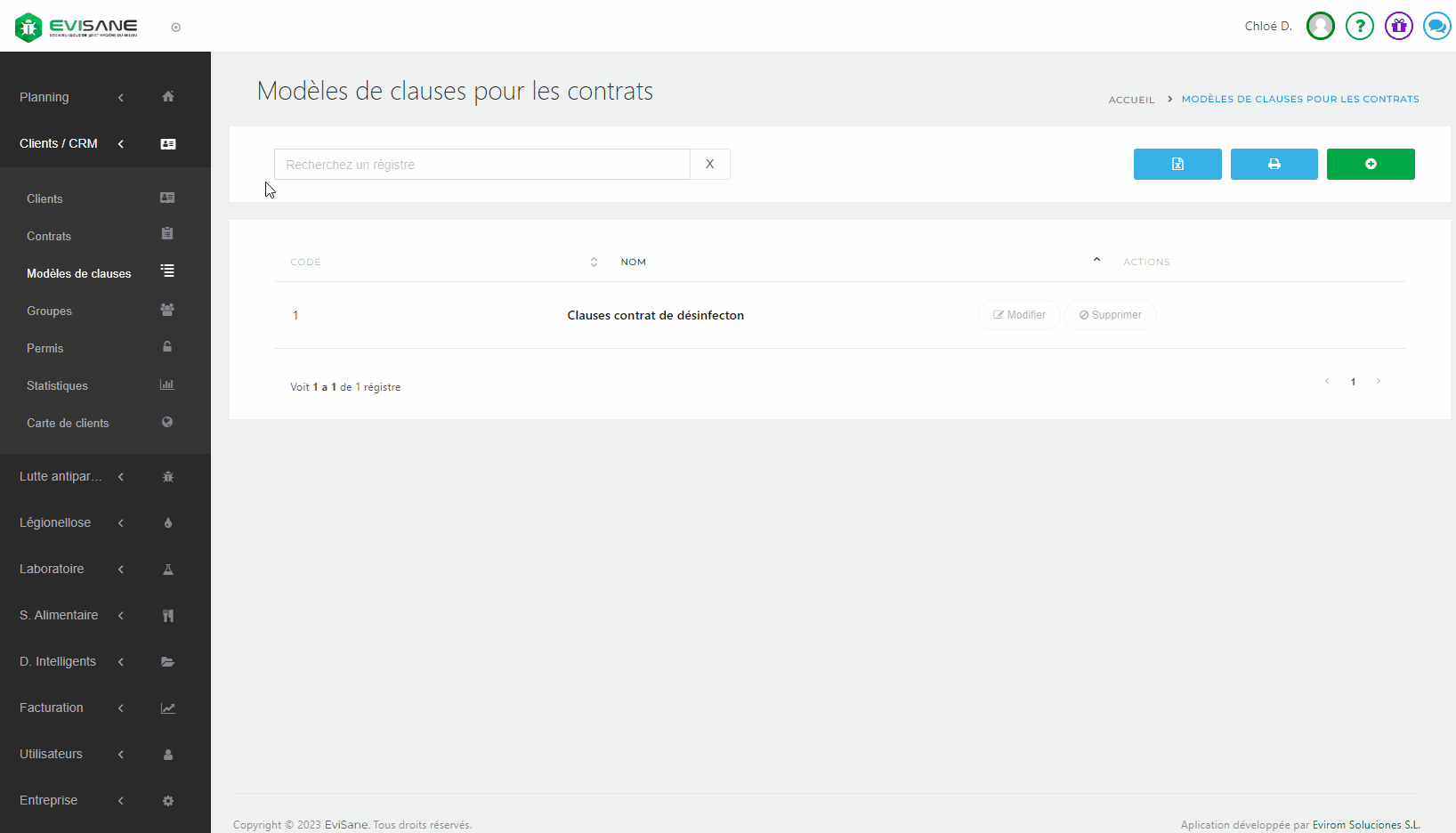 En ce qui concerne les fonctionnalités d’EviSane, nous avons mis en oeuvre une sous-section dans le module de « Clients » qui vous permet d’améliorer la planification de vos rendez-vous, augmenter et faciliter le contrôle de vos factures et de vos encaissements et, en outre, enregistrer sous signature toutes les conditions fixées avec le client. Et voilà, on parle de la fonctionnalité des « Contrats« .
