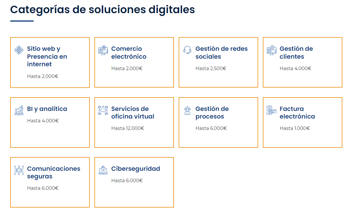 Así, por ejemplo, puede ser que tu empresa cuente con una página web actualizada pero carezca de un sistema para su gestión de procesos o servicios de oficina virtual. Por tanto, dependiendo de tu nivel de digitalización podrás optar a todas o solo a algunas de estas categorías. Ten en cuenta que el Estado asignará una cantidad subvencionable a tu empresa atendiendo al número de empleados que la componen y, además, será el encargado de entregar los fondos destinados para ti a los distintos agentes digitalizadores que hayas seleccionado.