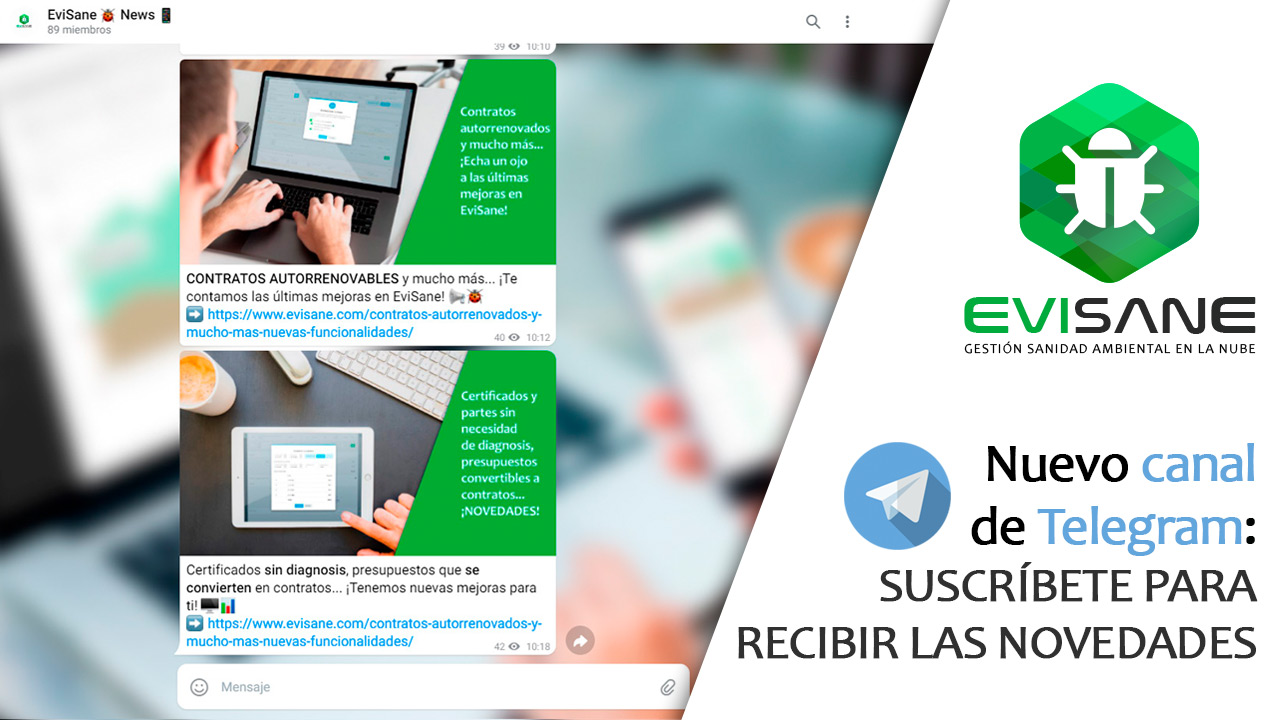 Tanto si usas Telegram asiduamente como si solo lo descargaste para poder seguir grupos con información que te interesa… ¿Qué te parecería poder suscribirte a un canal de EviSane? Queremos estar más cerca de ti y hacerte llegar todas nuestras novedades de la forma más sencilla y ágil posible, por eso hemos creado un canal propio en Telegram para que seas el primero en recibir todas las mejoras y noticias relacionadas con tu software favorito de control de plagas y sanidad ambiental directamente en tu móvil.