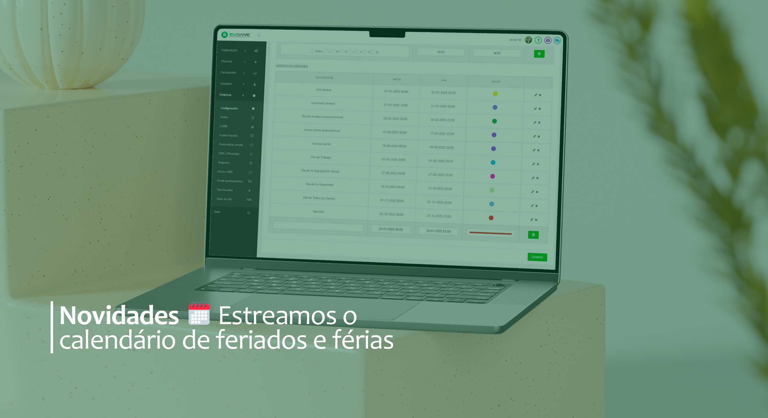 Na EviSane sabemos que gerir todas as áreas da tua empresa pode ser um desafio 🦴. Por isso, na nossa procura constante de aperfeiçoar o software na cloud 👨🏻💻👩🏻💻, voltámos ao trabalho para melhorar, uma vez mais, o controlo das jornadas laborais. Hoje apresentamos uma nova forma de gerir a 100% todas as situações que possam surgir 🗓️ no planeamento anual dos horários da tua equipa: bem-vindo calendário de feriados, férias e períodos indisponíveis! 👋🏻